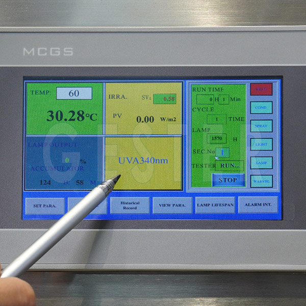 Durante el proceso, el equipo de prueba de intemperización acelerada UV monitoriza automáticamente la temperatura UV y la temperatura del agua. Esta máquina de ensayos para tejidos incorpora un controlador de irradiancia que regula y estabiliza la irradiancia a 0.68W/m2/340nm, 0.55W/m2/313nm u otros valores. Esto prolonga la vida de servicio de la lámpara UV.