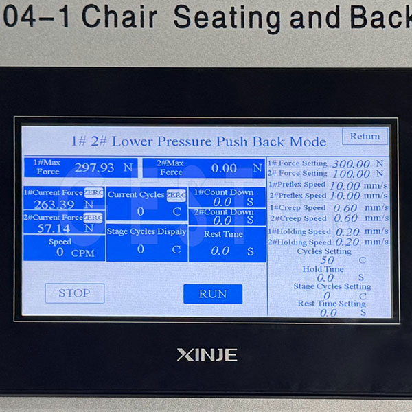 3. La máquina de ensayos para asientos y respaldos adopta la pantalla táctil PLC (controlador lógico programable) para el control, permitiendo una operación más conveniente.